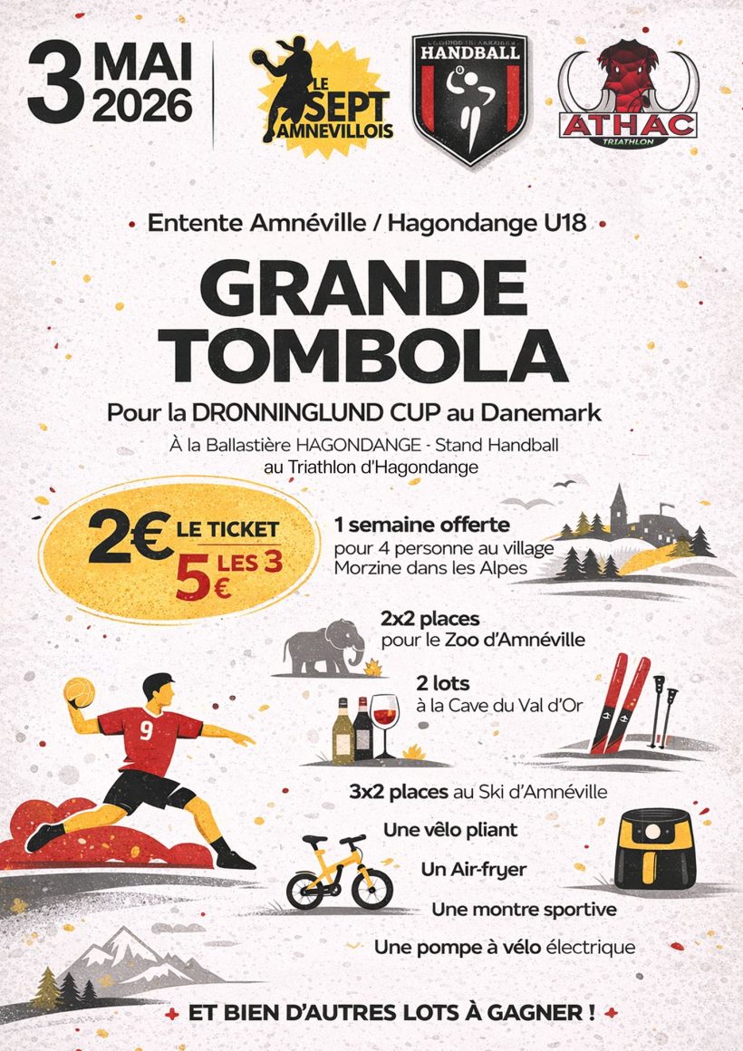 Le week-end prochain à l’occasion du Triathlon de la Ballastière organisé par les amis de l’ATHAC Triathlon vous pourrez soutenir le projet de notre entente -18 ans avec Sept Amnevillois en participant à une tombola avec de magnifiques lots en jeu. Merci par avance de votre soutien à ce beau projet !