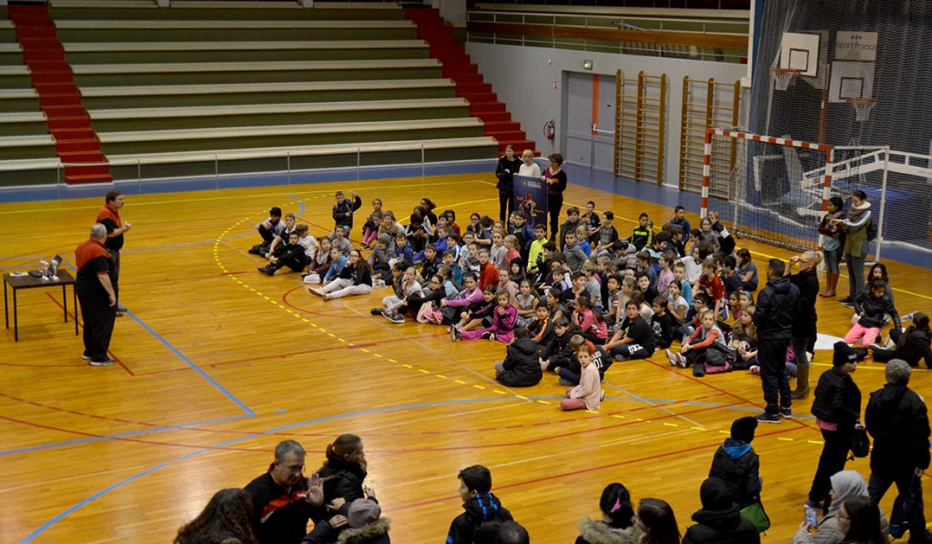 Dès 9h00 sont arrivés les différents protagonistes de cette matinée de handball destinée aux CM2… à savoir les classes de madame MELARD (BERGER), de mesdames LAURENT & STREMLER (BALLASTIERE), de madame HALLINGER (La Fontaine), de madame FOUBERT (VERLAINE), ainsi que de madame KLEIN (PAGNOL)… Soit 144 élèves.